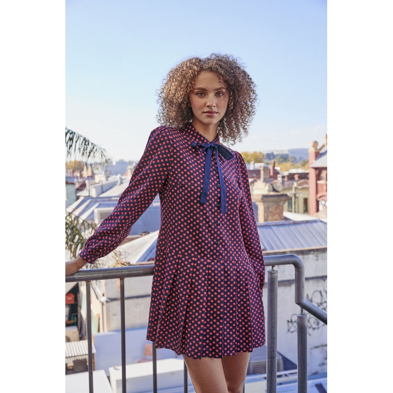 Retro style long sleeve mini dress, featuring a classic 60's inspired mini geo daisy print- drop waist - long sleeves with button cuff - pointed collar - button front to waist point - pleated mini length skirt - contrast front tie detail- made of a viscose