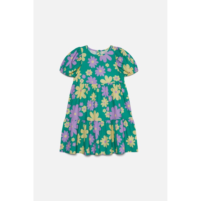 printed cotton seersucker dress for kids- soft cotton fabrication- short sleeve length- relaxed elastic sleeve opening- back snap fastening for easy on off- soft gathering at seams- features exclusive princess highway kids printProduct Code: PKGW080