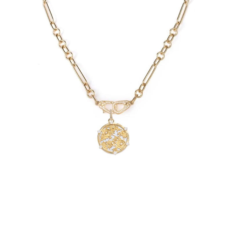 This medallion design was inspired by intricately carved decorative screens placed over a high shine gold surface, so that the gold shows through the etched-out parts of the floral latticework. Here, the yellow gold flowers shine on a white gold ground. This medallion features a Medium Pav Diamond Oval Annex Link, so you can easily clip it on and off the necklace for styling versatility.