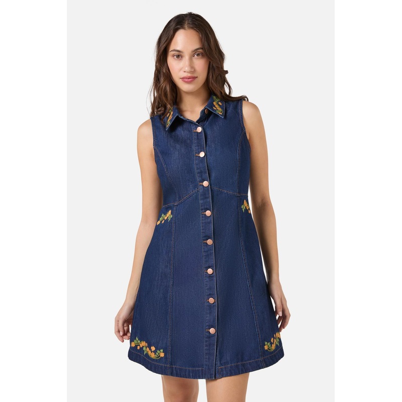 Denim sleeveless mini dress, featuring retro 70's flower embroidery. With button front, pointed collar & flared skirt. A casual transeasonal denim dress - copper styled button through front - classic pointed collar - mini length with flared shaped skirt -
