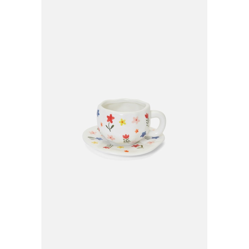Flower Cup & Saucer- The prettiest cup and saucer set- Sweet floral design- Cream with multi coloured flowers- Mug = Height 7cm, Diameter of top 8.5cm (approx)- Saucer = Diameter 15.5cm- Measurements are a rough guide as the shapes are slightly abstract- M