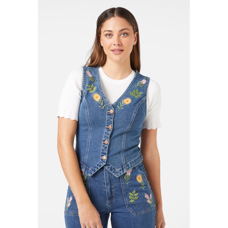 Wild flower embroidered denim vest, with a v neckline & button through front. Style as a matching set with the flower mix jean- wild flower embroidery along front neckline- can be paired with the matching embroidered denim jean- front button opening- v nec