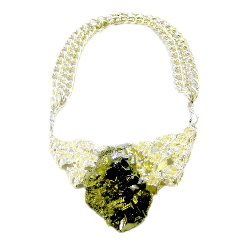 This Extraordinary Fool’s Armour Collier necklace is made from raw fool’s gold minerals sourced locally from the Natural History Museum.