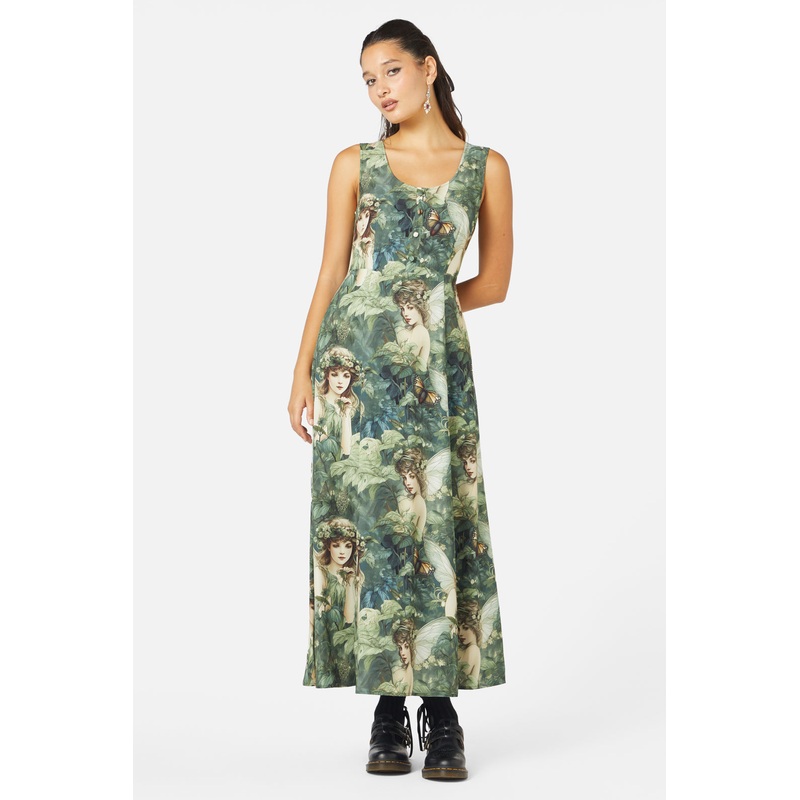 Maxi Dress-Round Neckline-Sleeveless Style-Fitted Bodice-Relaxed-Fit Skirt-Zip Closure At Back-All-Over 'Forest Fae' Graphic-Made From Soft Viscose-Available In GreenProduct Code: BGFX242