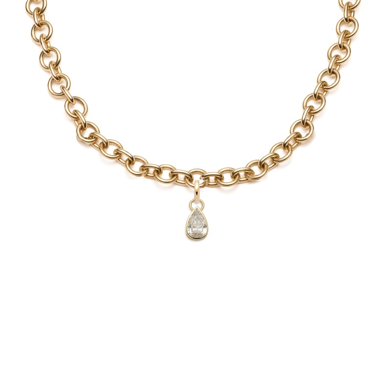 Handcrafted in 18 karat yellow gold, this adjustable 16″ Midsize Mixed Clip Link Necklace features a Forever & Always a Pair Diamond Pear Pendant, representing True Love. Each pair comes at a time in our lives when something just feels right. These pairs of pears, we absorb them, fuse them into our own hearts, and our heart grows as a result. Its those pairs we choose to keep; friends, lovers, family, chosen family, a part of our heart forever. Forever and always, perpetually, and unceasingly bound.