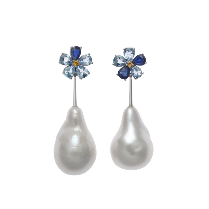 TheForget Me Not Aquamarine Baroque Earringsaremade from ethically and sustainably sourced14k gold. Each earring features a forget me not flower with aquamarine and blue sapphire petals, and a baroque pearl at the end of each stem.Part of Basak Baykal'sFor
