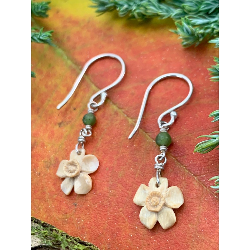 Mammoth Ivory, Jade & .925 Sterling Silver French HooksSize - 10mm flowerFossil Information Card Included