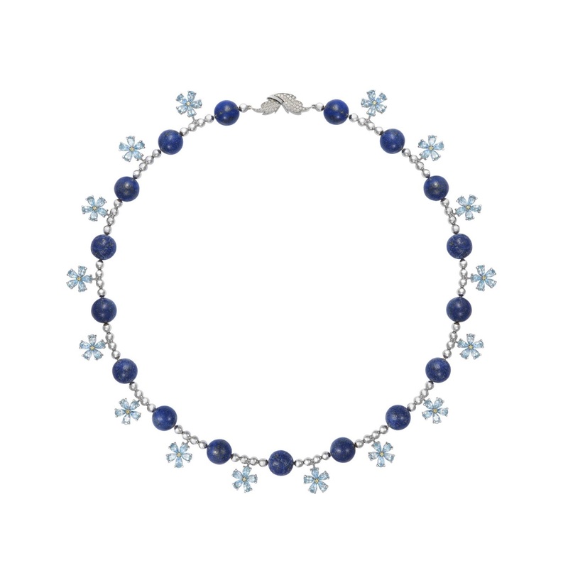 TheForget Me Not Necklace ismade from ethically and sustainably sourced18k gold. The necklace features forget me not flowers with aquamarine petals and a diamond centre, which are interspersed withlapis lazulli beads.Part of Basak Baykal'sForget Me Not Col