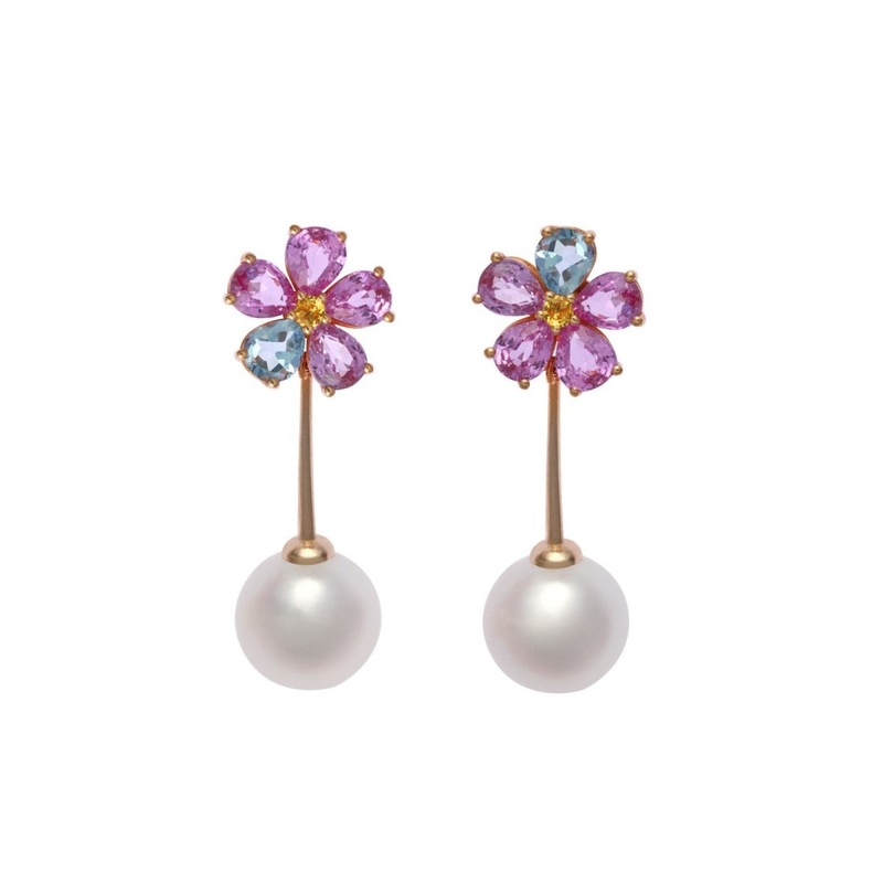 TheForget Me Not Pink Sapphire Earringsaremade from ethically and sustainably sourced14k gold.Each earring features a forget me not flower with petal shaped pink sapphires and an aquamarine, and a pearl at the end of each stem.Part of Basak Baykal'sForget