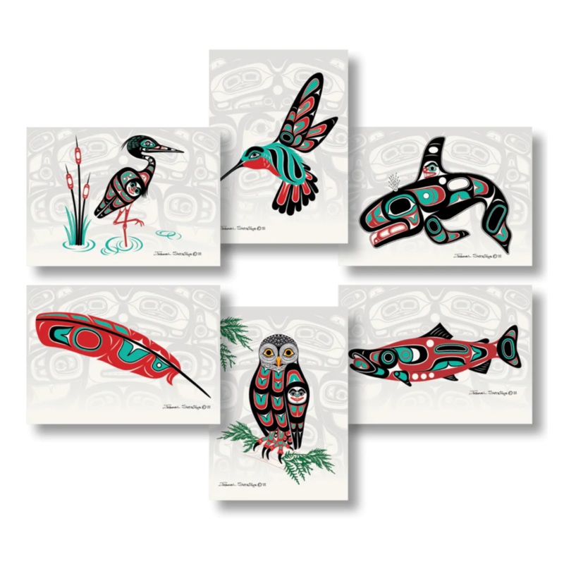 Tlingit formline designs by Israel ShotridgeCollection of Six 5 X 7 Art Cards includeHeronHummingbirdKiller WhaleRed FeatherOwlNorthwest Salmon