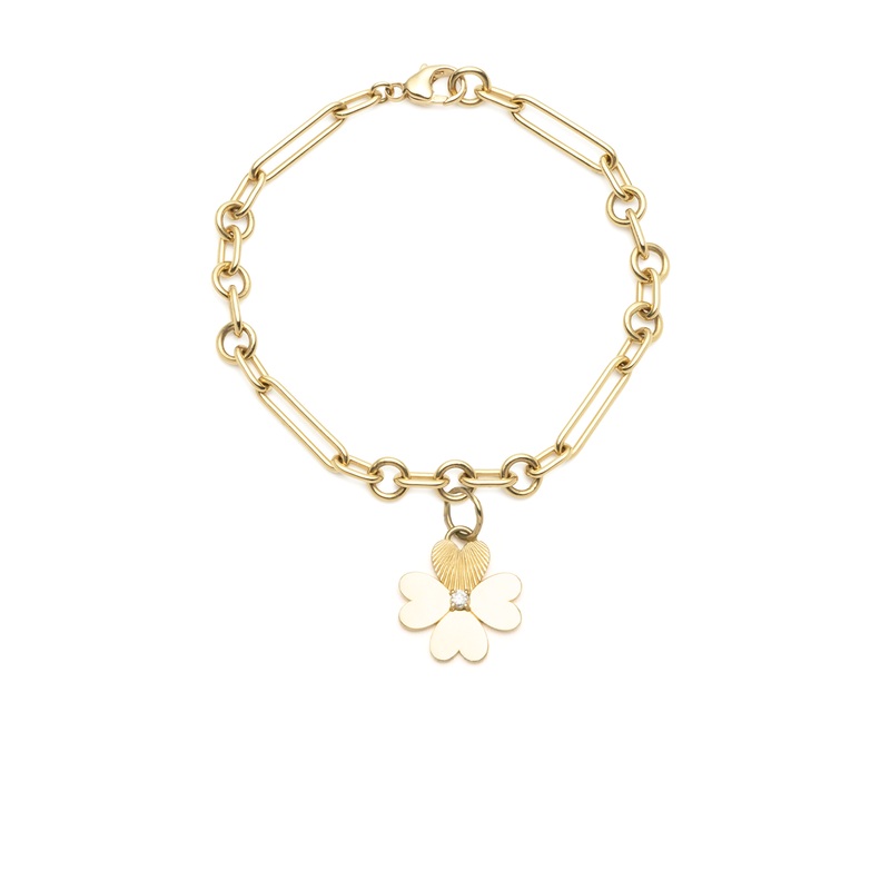 Description:Handcrafted in 18K Yellow Gold, this Small Mixed Clip Bracelet is shown with our Mini Four Heart Clover Medallion. The Four Heart Clover represents True Love. Four hearts combined to create the four heart clover. The clover is a symbol of fire.
