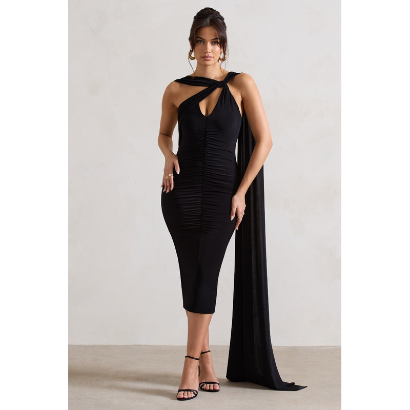 Freedom | Black Strappy Asymmetric Cut-Out Midi Dress With Cape