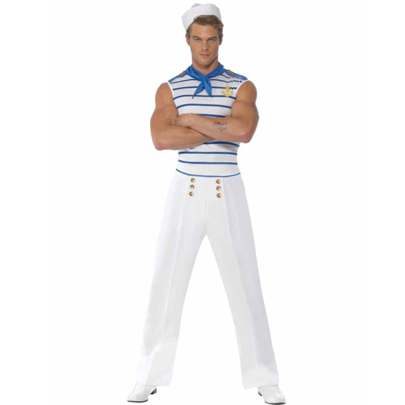 This Fever French Sailor Mens Costume is certainly a different take on your traditional sailor costume. A little less conservative, this costume consists of a blue and white striped vest top with gold anchor on the chest and shoulder epaulettes with a pair of white elasticated waisted pants decorated with gold buttons. A jaunty bright blue neck scarf completes the outfit. Just add a gob cap (sailor hat to you!). Perfect for dress up parties, themed events and much more.