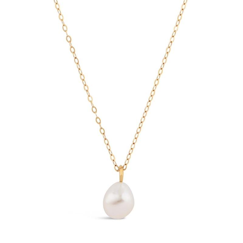 The lustrous Freshwater Pearl Pendant in 100% recycled 9k yellow gold features a rare AAA quality Baroque pearl that is suspended from a 9k gold hammered cable chain.