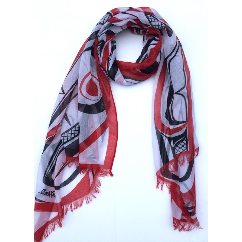 Poly Woven Shawl withFrog box design by Bill Helin. Available in Black/ Red or Turquoise.70x180 cm/ 72" x 27"