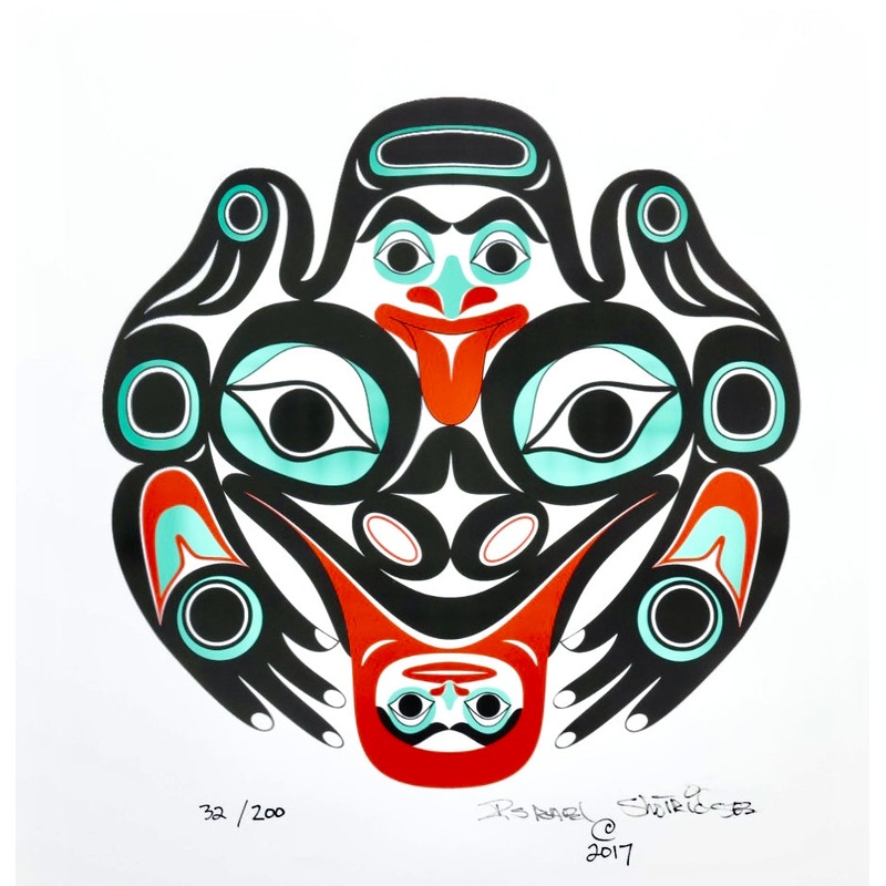 Double Matted Print by Tlingit master carver, Israel Shotridge Outer Mat sizes available: 10 X 12Framed and Artist Signed Giclee print "Frame size 8" x 8" Print size 5.5"x 5.5"12 x 12 Limited Edition is signed and numbered by Artist 32/200The Frog is a mys