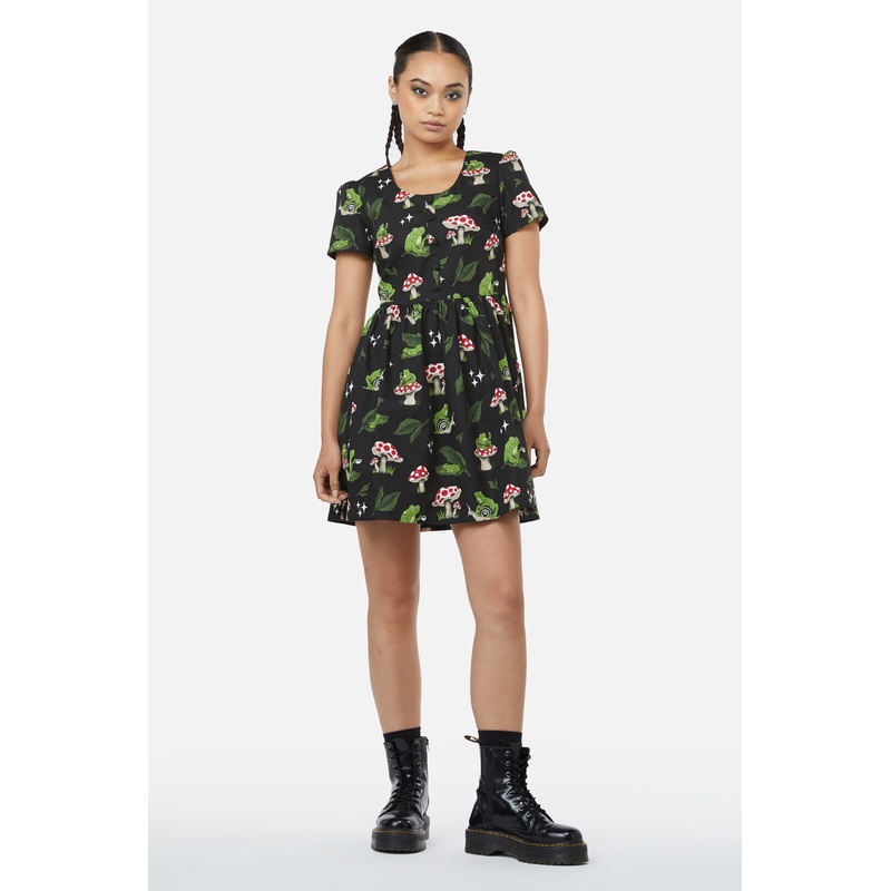 Graphic Printed Dress-Features ‘frog Friends’ Artwork-Fit And Flare Cut Style-Short Sleeves-Round Neckline-Made From Cotton-Available In Black