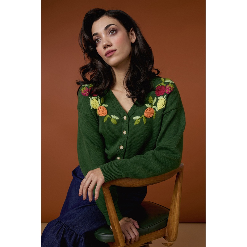 Green v-neck cardigan. Hand embroidered with fresh fruits in vibrant colours - relaxed fit though body with drop shoulder - v shaped neckline- long sleeves- button through front - ribbed cuff, hem and neckline- knitted of a cotton acrylic blend yarn- avail