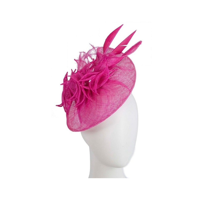 Hand made from quality sinamay, this fuchsia racing fascinator sports elegant shape topped with generous feather cocktail and two long arrow feathers. Perfect choice for your racing outfit.Designed in Australia by Max AlexanderReal sinamayComfortable headb