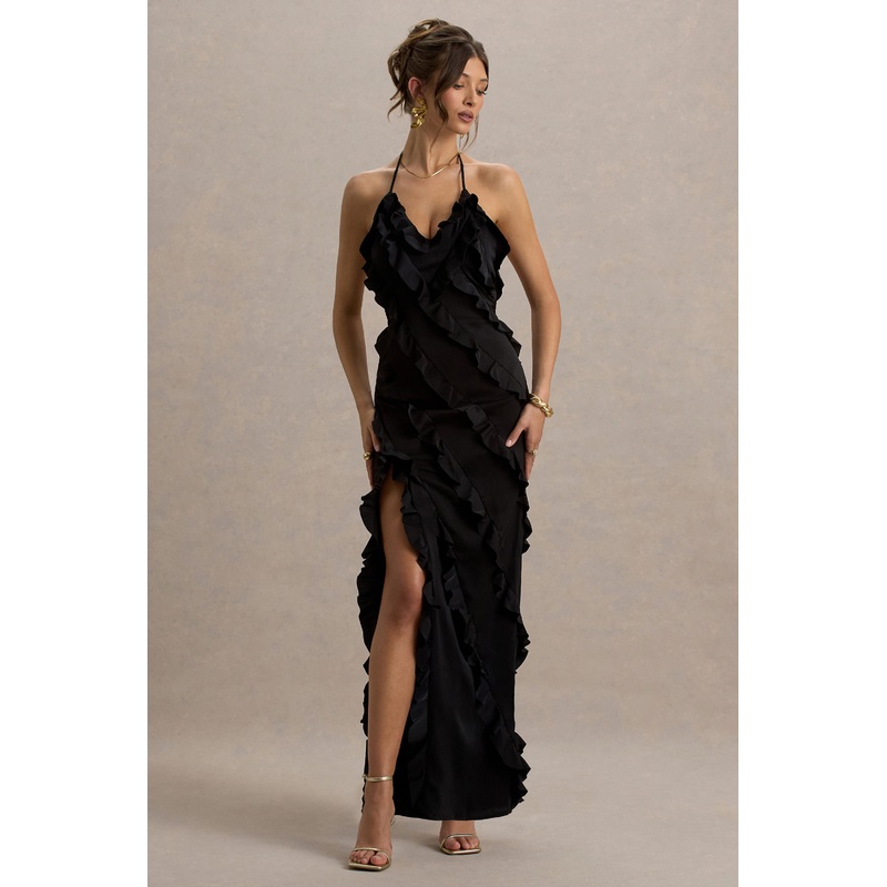 Full On | Black V-Neck Ruffle Maxi Dress