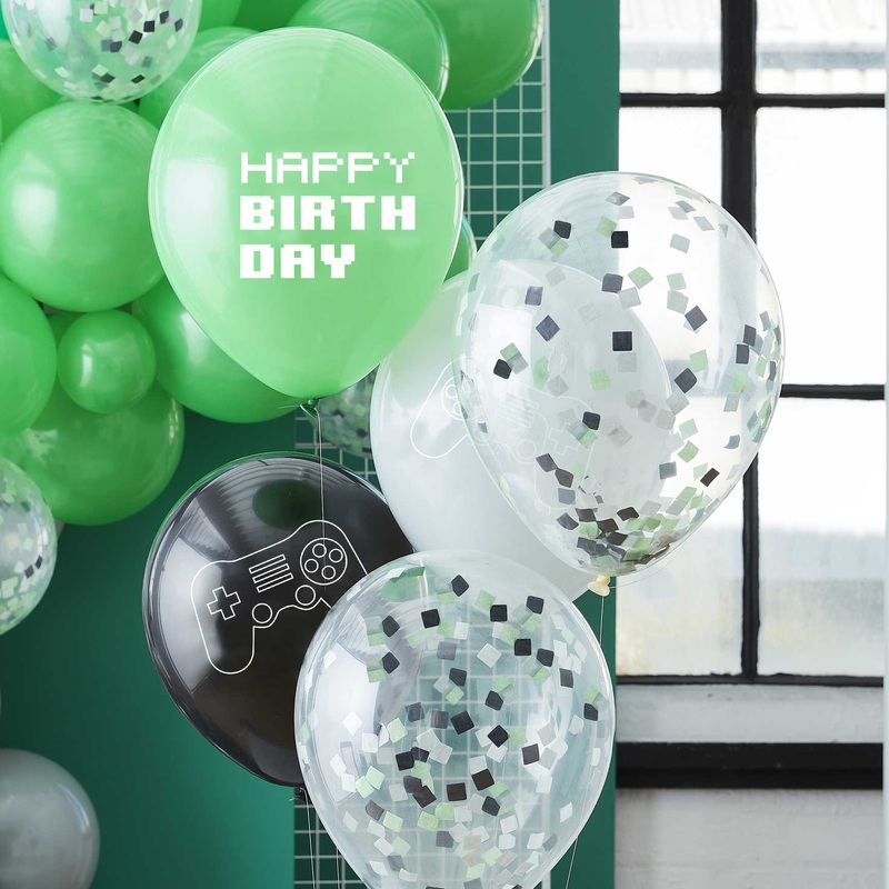 Each pack contains:1 x 12 inch 'HAPPY BIRTHDAY' green balloon1 x 12 inch Grey balloon with controller graphic print1 x 12 inch Black balloon with controller graphic print2 x 12 inch Clear latex balloons with confettiPlease note: Balloons do not come inflat