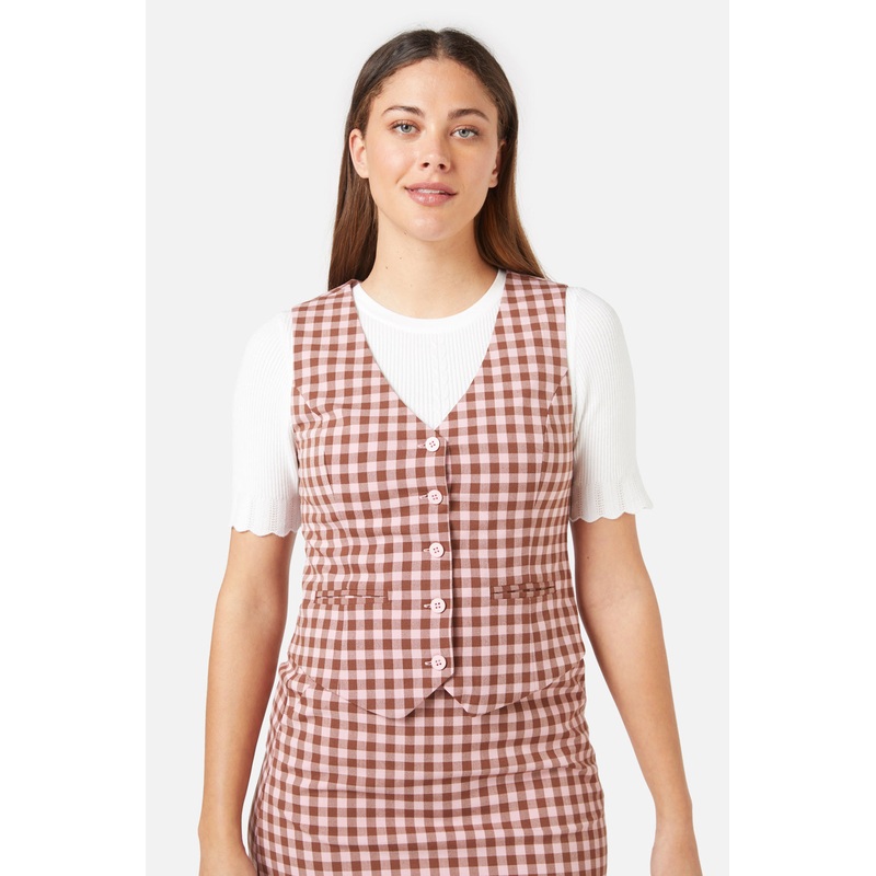 Pink & Chocolate check vest, with v neckline & button through front. Wear as a two piece set with our gelati gingham pant or skirt. - fitted style- v shape neckline- button down front- pointed hem shaping- made of a polyester, viscose, elastane blend - ava