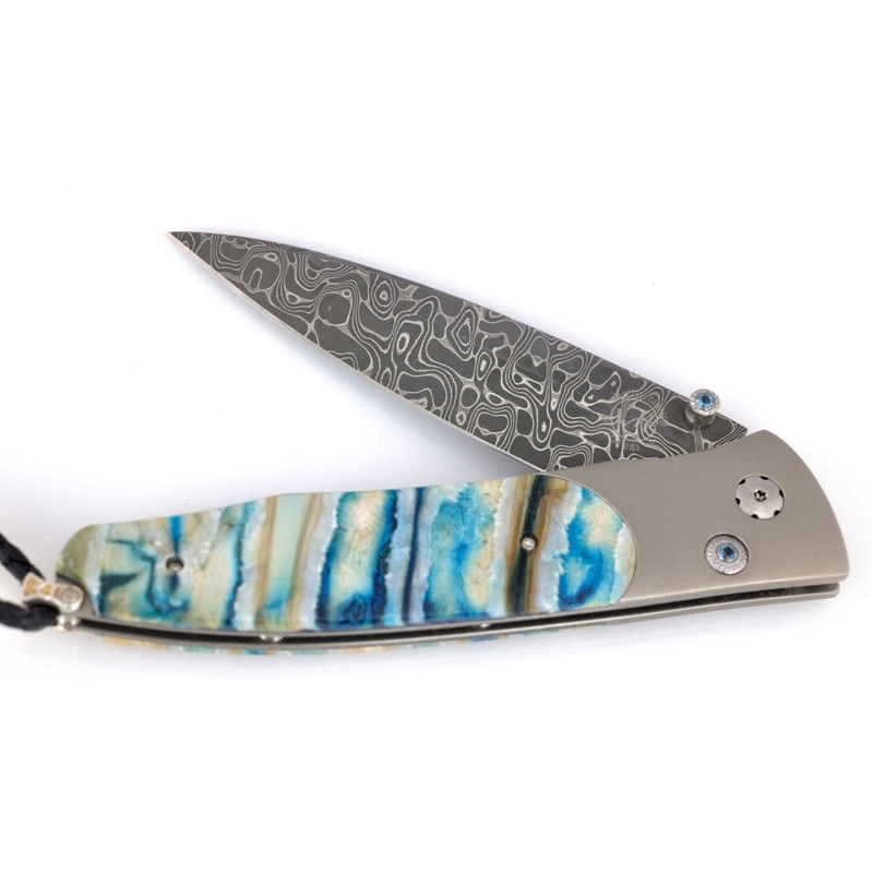 The Gentac Teal features a lightweight yet durable titanium frame, inlaid with 10,000 year-old fossil Woolly Mammoth tooth. The blade is hand-forged 'Intrepid' damascus steel by Chad Nichols; the one-hand button lock and the thumb stud are set with Kashmir