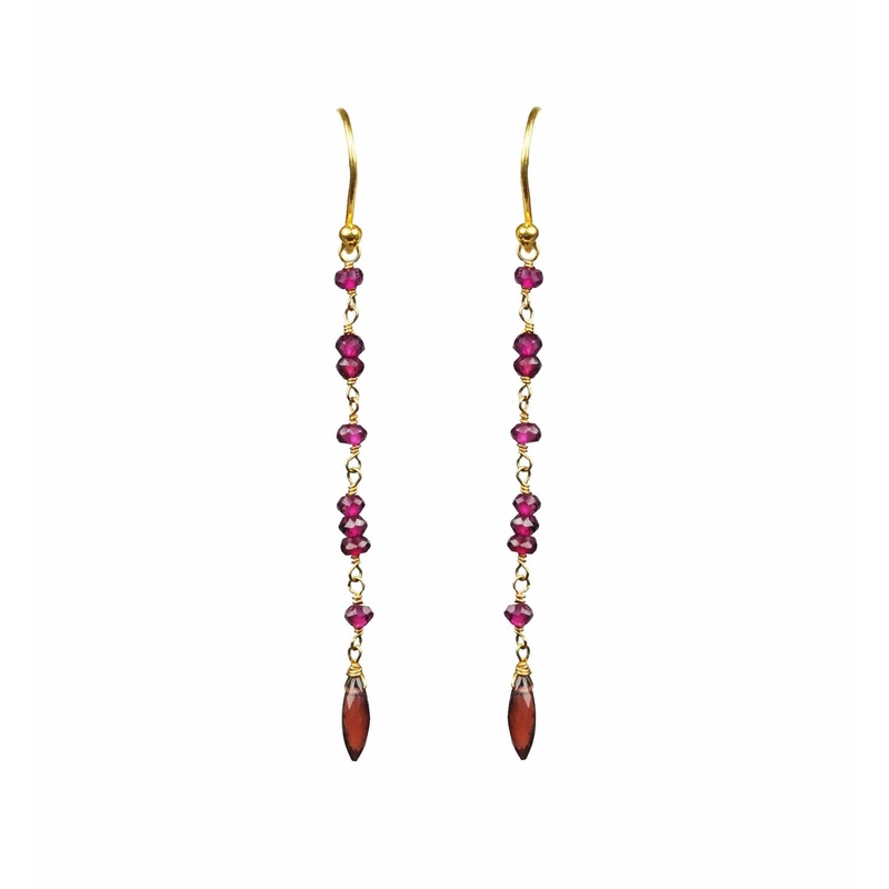Garnet.18kt gold-filled wire wrapping.18kt vermeil, gold plate over sterling silver earrings.2 1/4 inch total drop length.