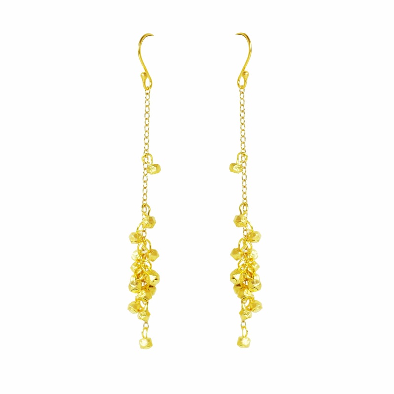 14kt gold plated nugget beads.14kt gold-filled chain.14kt vermeil, gold plate over sterling silver earrings.2 1/4 inch total drop length.