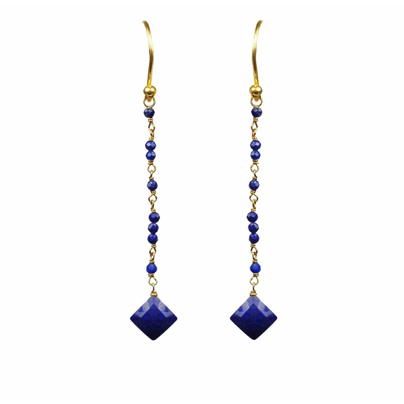 Lapis lazuli.18kt gold-filled wire wrapping.18kt vermeil, gold plate over sterling silver earrings.2 1/4 inch total drop length.