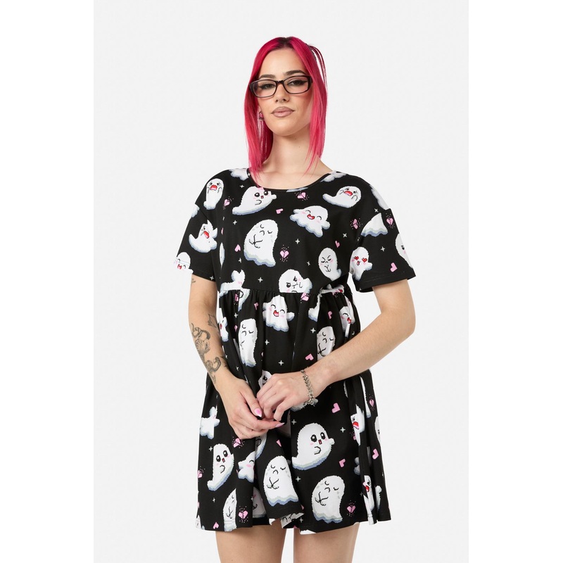 Graphic Print Jersey Dress- Relaxed Fit- Short Sleeves- Round Neckline- Skirt Is Gathered At Waistline- Pockets At Sides- All-Over 'Ghostie' Print- Made From Cotton Jersey- Available In BlackProduct Code: BGFZ057