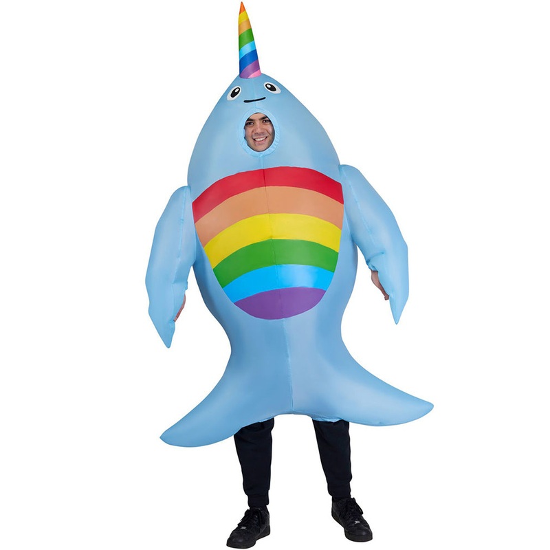Yes, narwhals are real animals, and now you can dress up as one with this Giant Narwhal Inflatable Adult Costume. Narwhals, often called the unicorns of the sea, are a species of whale with with long tusks protruding from their headsjust like a unicorn! This Giant Narwhal Inflatable Adult Costume is a stylised version of the real thing, with a large, light-blue inflatable body, inflatable fins around the wearer’s arms, and an inflatable tail around the wearer’s knees. Costume features a spiral rainbow horn, cute printed cartoon face details, a large rainbow design on the front, and an oval cut-out for the wearer’s face. This delightful, colourful and unique costume is sure to be a hit at your next sea-creature-themed event or pool party.