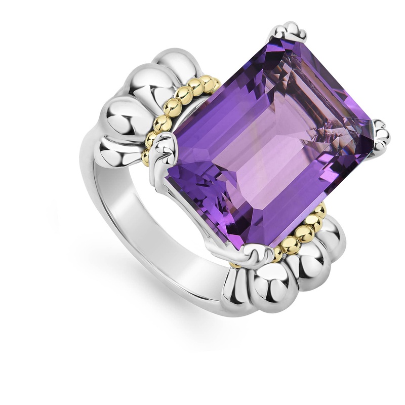 The return of a icon. Our signature emerald-cut amethyst gemstone ring with a prong setting in sterling silver and 18K gold Caviar beading.