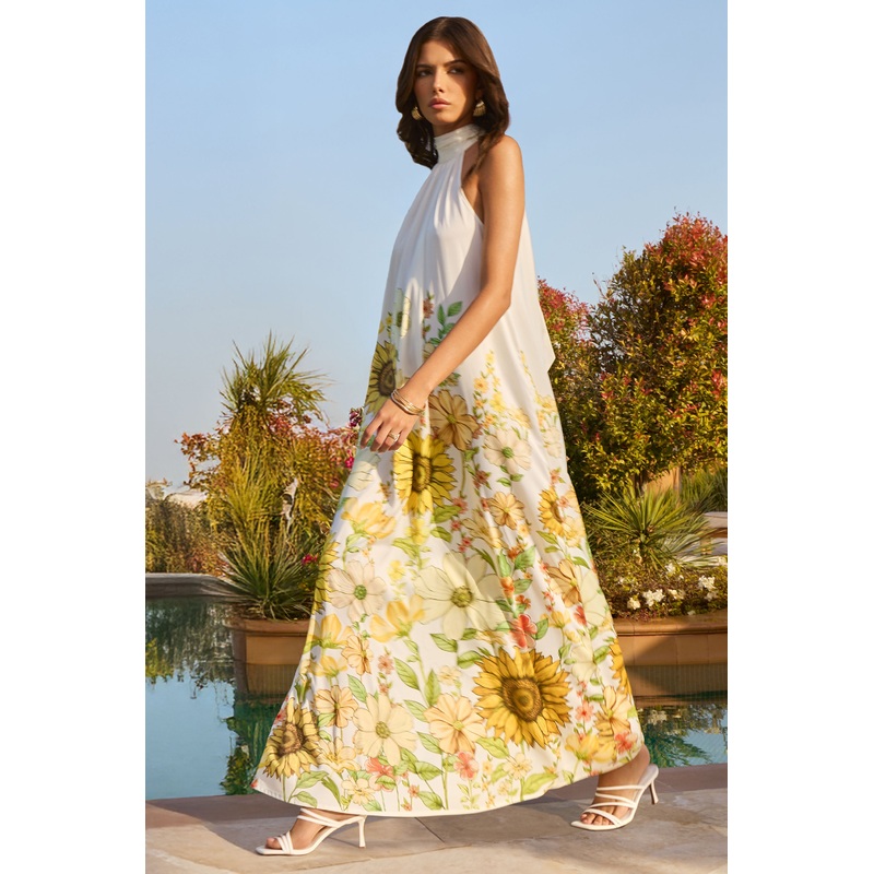 Designed to make an entrance our Glide maxi dress has arrived. Crafted from our premium satin that skims over your curves gorgeously, this dreamy sunflower print maxi is the definition of summer glam. The high neckline ties elegantly at the back, adding a