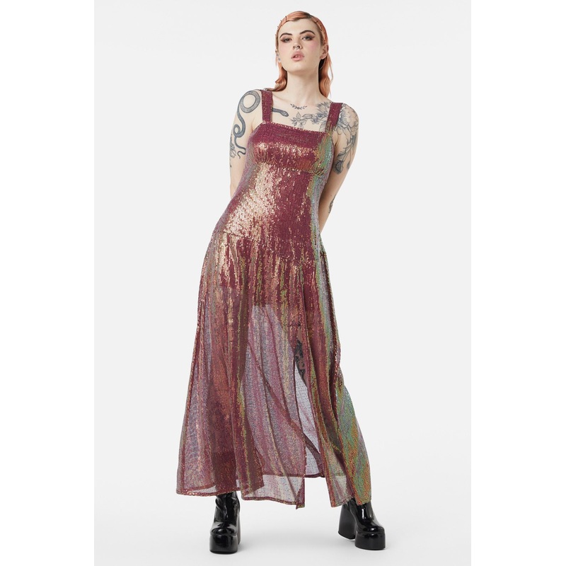 Sequin Dress – Fitted Shape – Maxi Length – Slit At Side Front – Shoulder Straps – Zip Closure – Made From Polyester Sequined Mesh – Available In Champagne & Raspberry