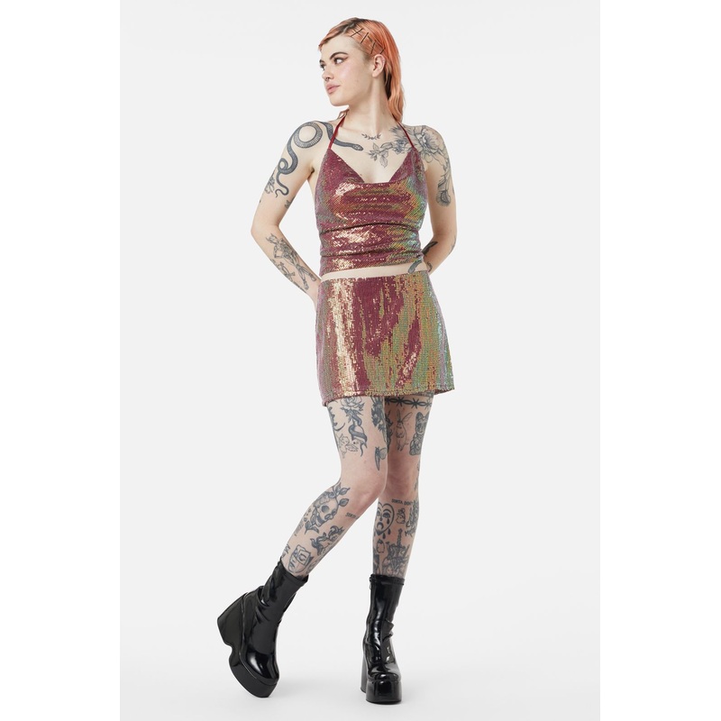 Sequin Top- Halterneck Style- Draped Neckline- Fitted Shape- Adjustable Tie At Back- Non-Stretch- Made From Polyester Sequin Mesh- Available In Champagne & RaspberryProduct Code: DGFW407