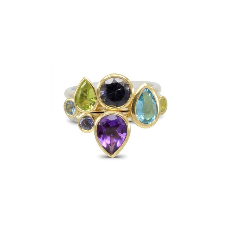 Diverse Gemstones: The Gold Amethyst Topaz Stacking Ring isset with a variety of gemstones, including a pear-shaped amethyst, peridot, blue topaz, large and small round iolite, blue topaz, and yellow tourmaline. This diverse selection of gemstones adds colour, depth, and individuality to the design.