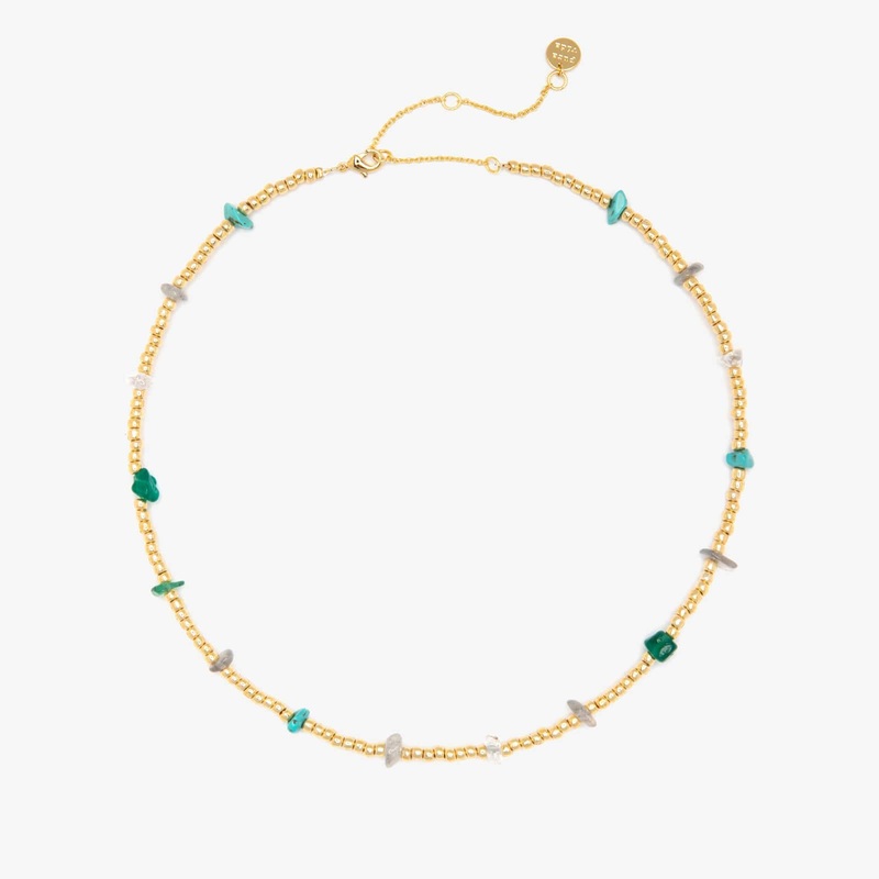 Our Earth Day Gold Bead & Stone Chip Choker is the definition of eco-chic. This made-to-layer style features an array of gold beads with labradorite, moss agate and turquoise stones spread throughout. For every necklace sold, Pura Vida will donate 5% of th