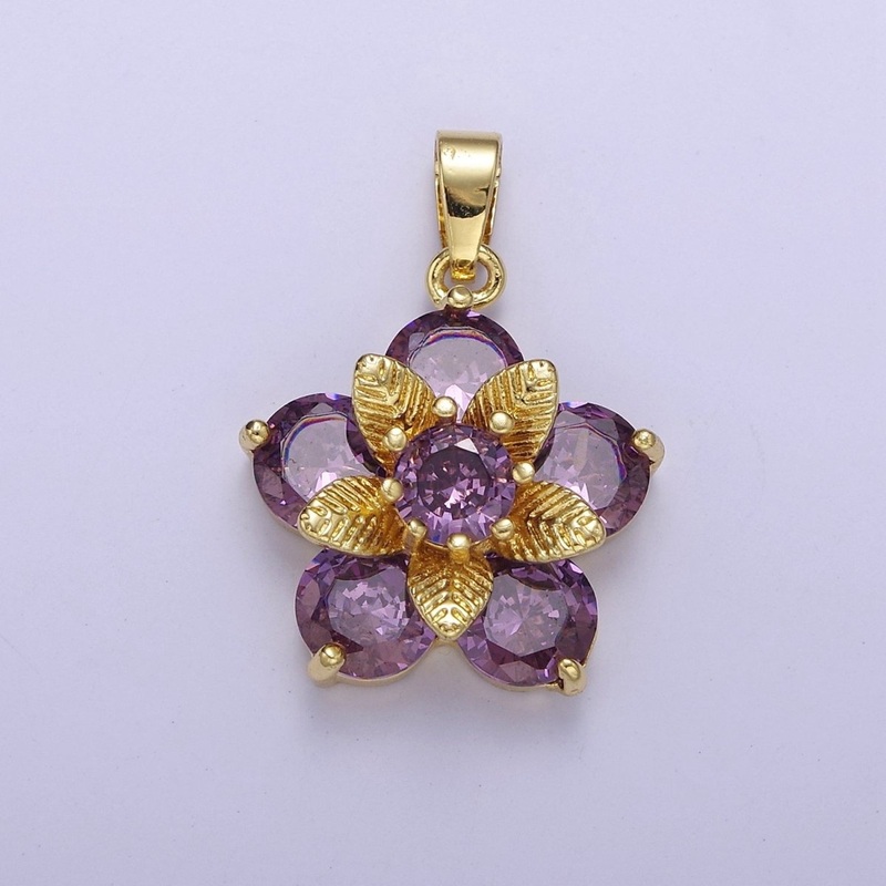 Gold Daisy with Amethyst Purple Cubic Zirconia CZ, Flower Pendant For Jewelry Necklace Making, J-527