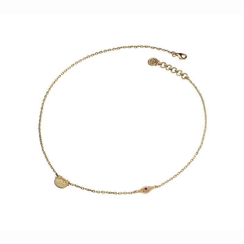 The Gold Happiness Necklace is an everyday 18kt Gold necklace, adorned with Sapphires, Diamonds, and Azza Fahmy's signature Calligraphy - -Happiness - in addition to a protective Evil Eye to guard from envious onlookers, and Lotus Blossoms symbolising rene