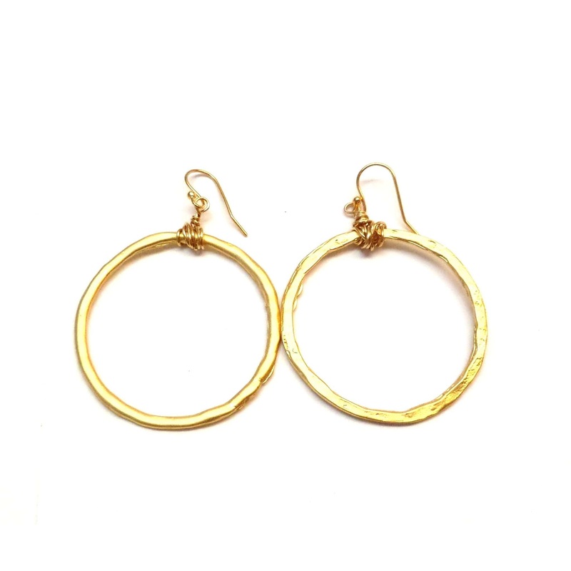 Beautiful gold-plated hoops over brass with hammered design that is lightweight. 1.5" pierced.