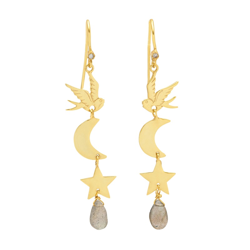 The Gold Labradorite Aphrodite Earrings are made in 18ct gold vermeil and feature a dove, star and moon charm, plus, a labadorite gemstone dangling from a hook earring set with a natural white zircon stud. Labradorite promotes healing, and relieves stress