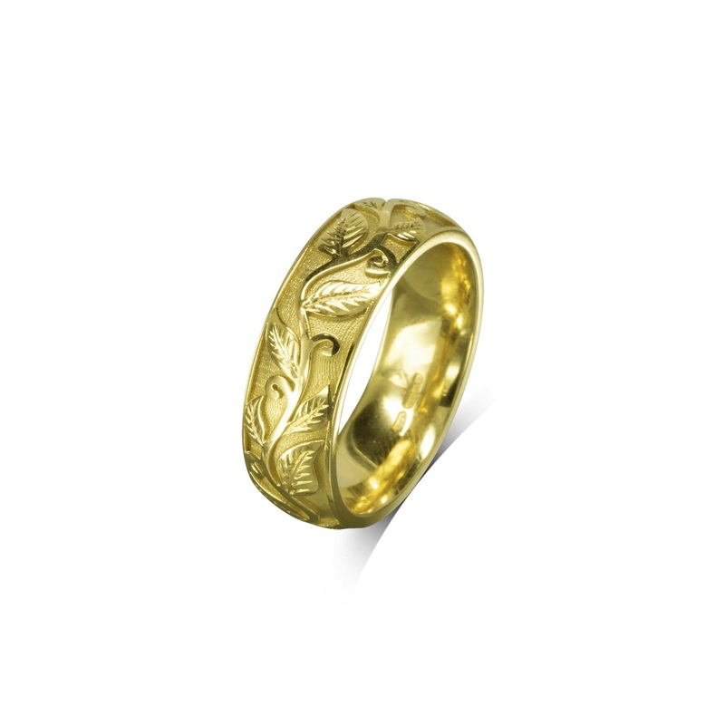 The Gold Leaf Motif Wedding Ring is inspired by the beauty of nature's intricate designs.Nature-Inspired Design:seaweeThe design mimics the organic and flowing shapes found in nature. The wide band showcases a beautiful depiction of a trailing vine, captur