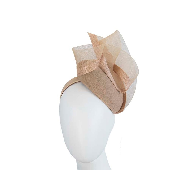 Hand made nude gold fascinator for autumn & winter races. Classic pillbox base, trimmed with crinoline and abaca fabric and placed on the headband for easy wear. Made in Australia Headband for easy wear Perfect racing accessory