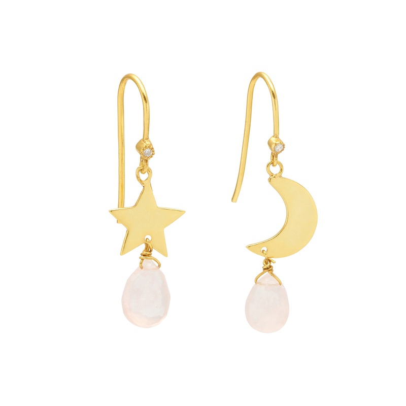 The Gold Rose Quartz Astria Earrings are made in 18ct gold vermeil and feature star and moon charms, and a rose quartz gemstone dangling from a hook earring set with a natural white zircon stud. Rose quartz is the stone of unconditional love and enhances p