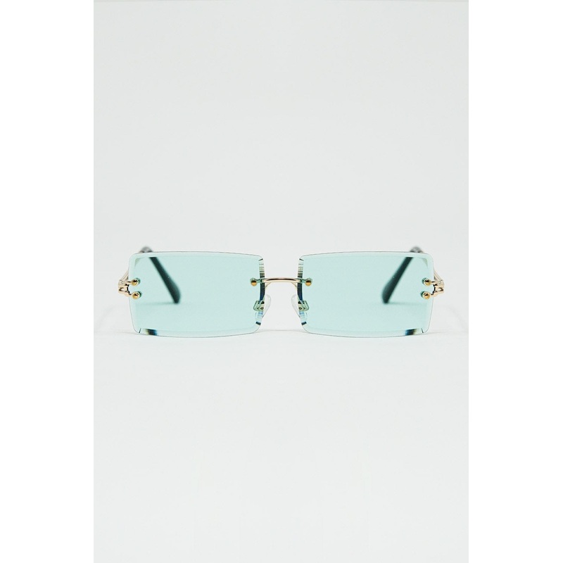 Gold Thin Rimless Square Sunglasses With Turquoise Lenses