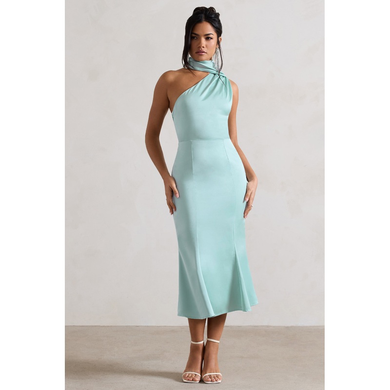 Golden Girl | Mint Satin One Shoulder High-Neck Flared Midi Dress