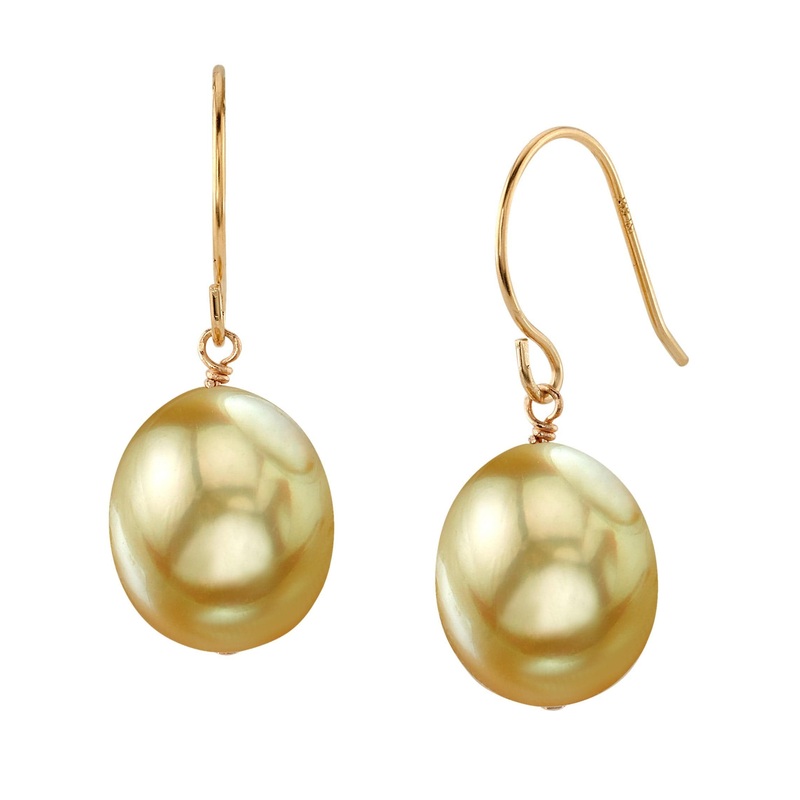 Simplicity and elegance have never made such a perfect combination. A beautiful pair of Golden South Sea drop-shape pearls on elegant 14K yellow gold chain. The pearl earrings have 'High' grade luster, our highest category available. These trendy earrings