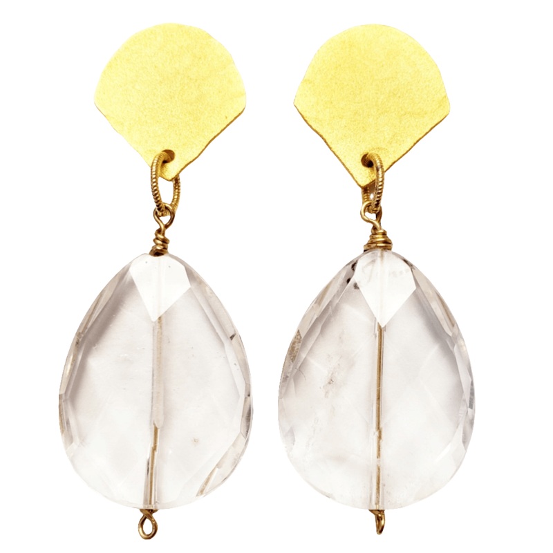 Beautiful gold-plated or silver plated earrings of faceted clear quartz stones. Statement earrings. 2" for gold and 1.75" for silver. Post style, pierced.
