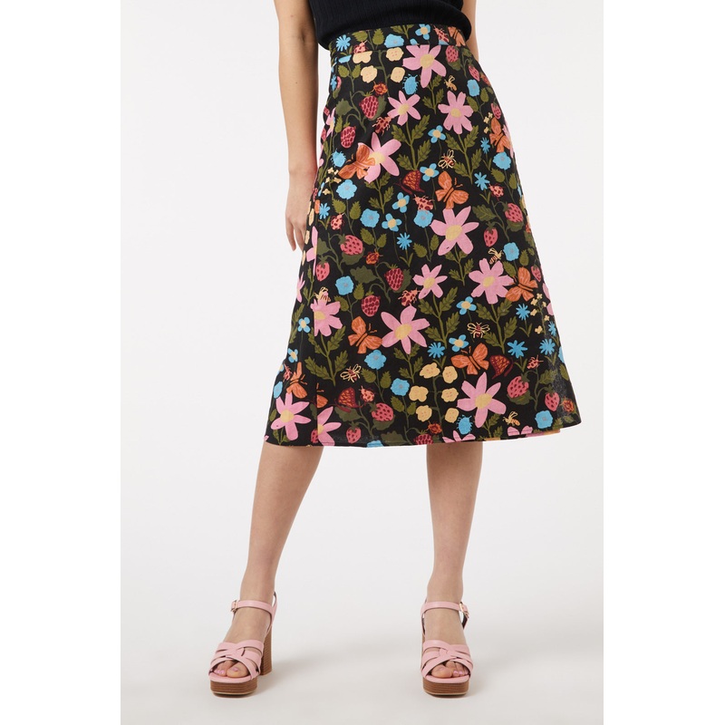Spring floral printed wrap midi skirt- discover all sorts of cute creatures & juicy strawberries amongst hand painted blossoms- crafted of soft linen cotton fabric- midi skirt with a-line silhouette- wrap style with waist tie closure- available exclusively